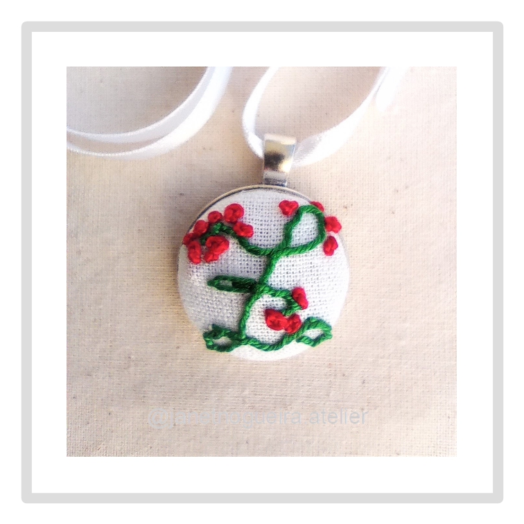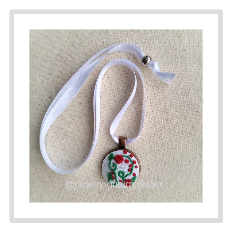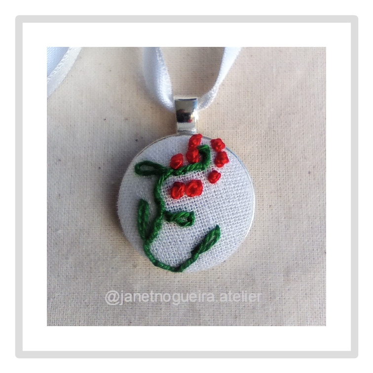 • Colar com pendente bordado à mão em tecido branco com flores vermelhas e ramos verdes.
