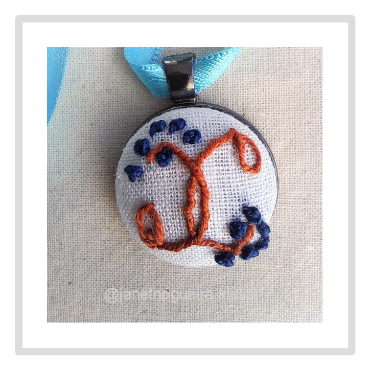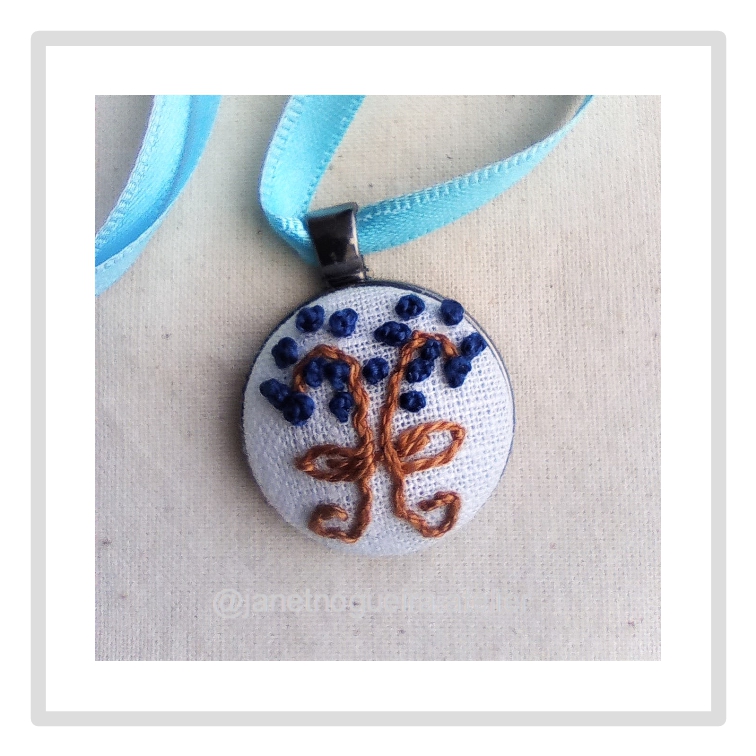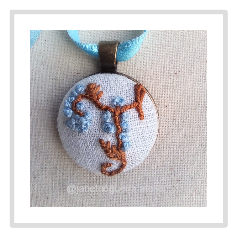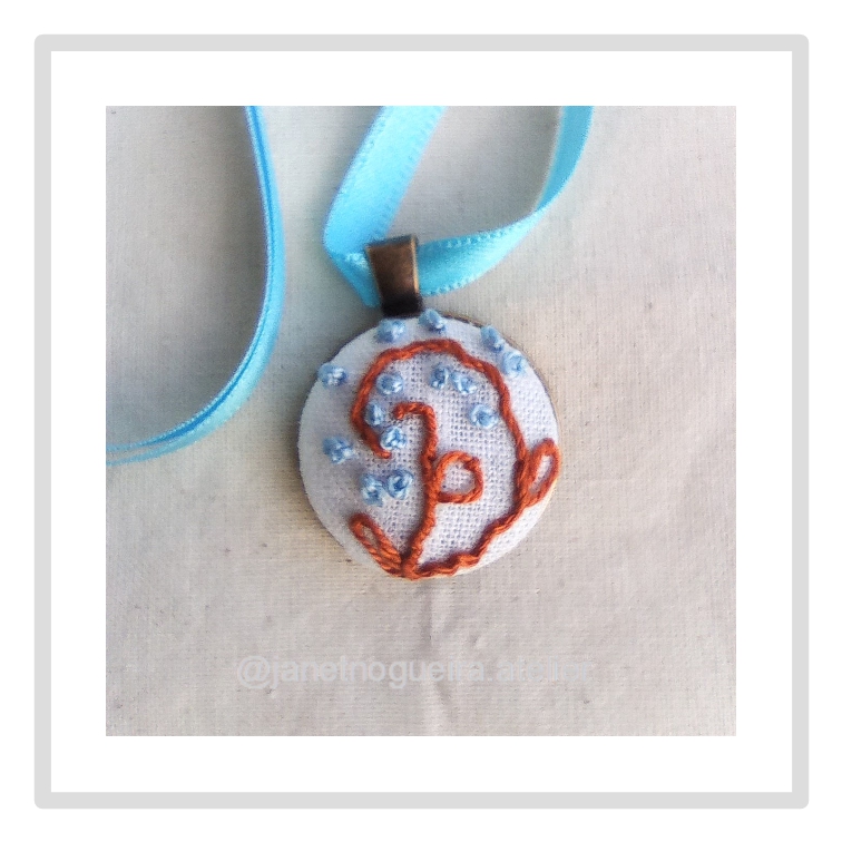 • Colar com pendente redondo bordado em tecido branco, com linhas castanhas e pontos azuis, e fita azul clara
