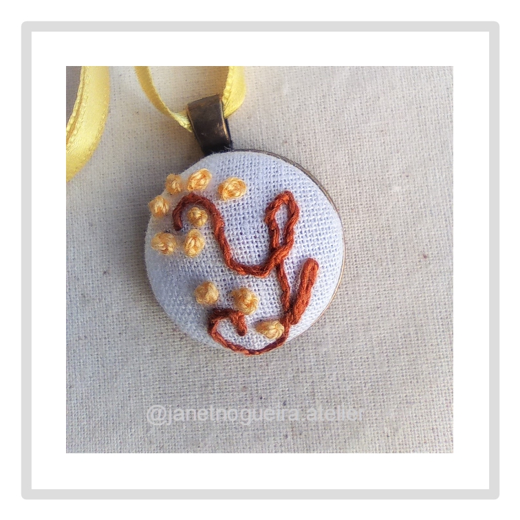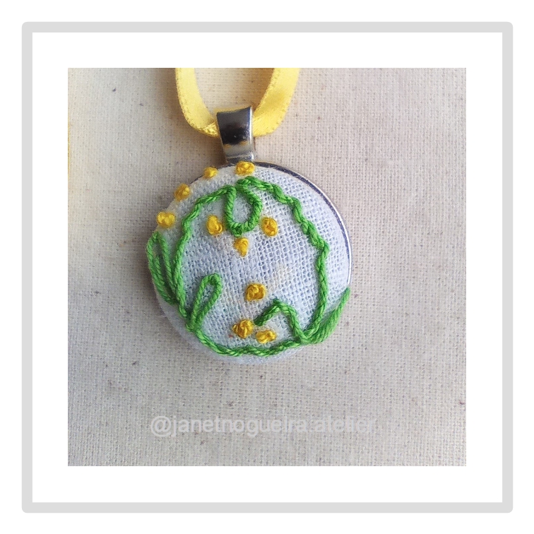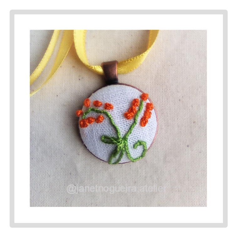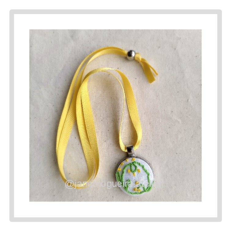 • Colar com pendente redondo bordado em tecido branco com fios verdes e laranja e fio amarelo.