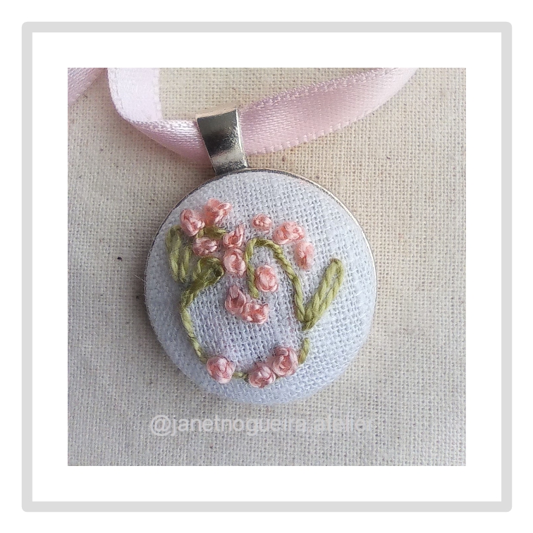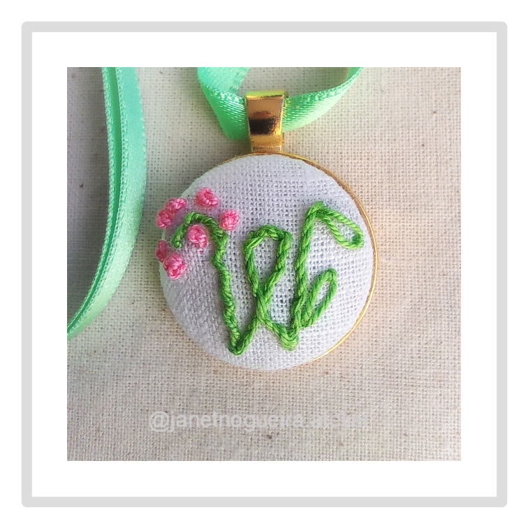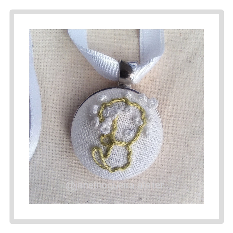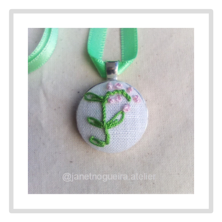 Colar com pingente bordado à mão, Monogramas com flores, fitas de cetim e conta para ajustar tamanho.