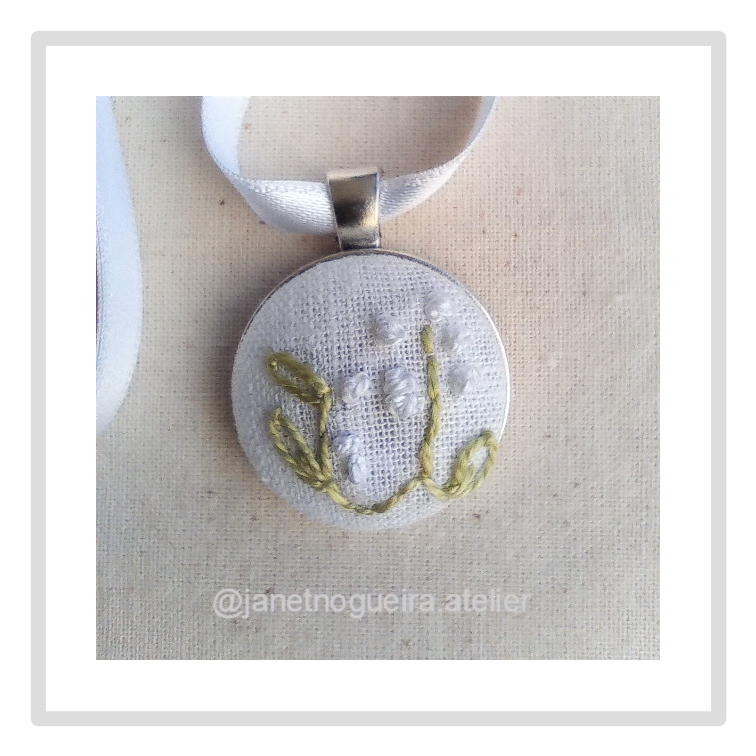 • Colar com pendente redondo de tecido branco bordado com letras em linha verde