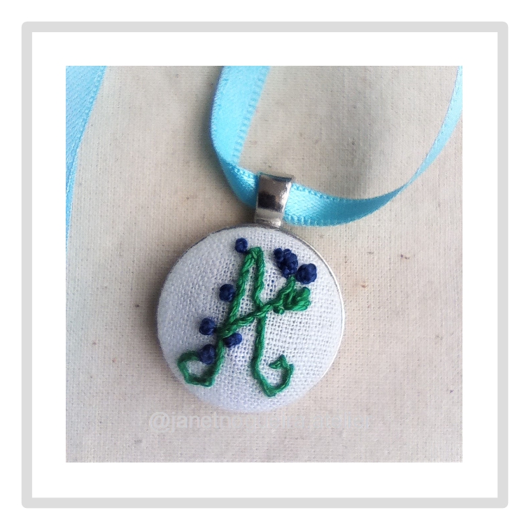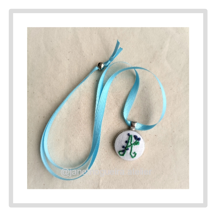• Colar com pendente bordado com letra A e flores azuis