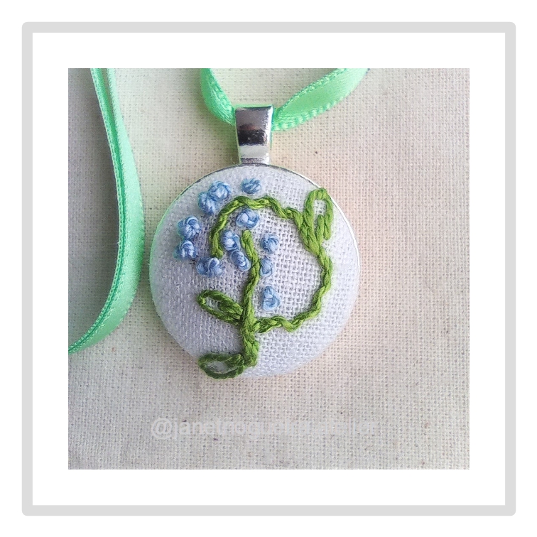 • Pendente redondo com bordado azul e verde em tecido branco e fita azul
