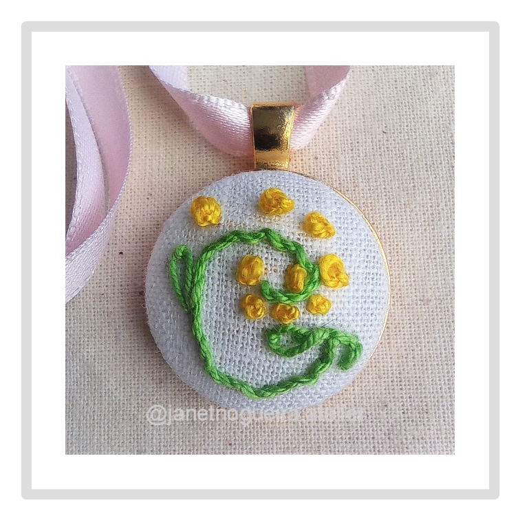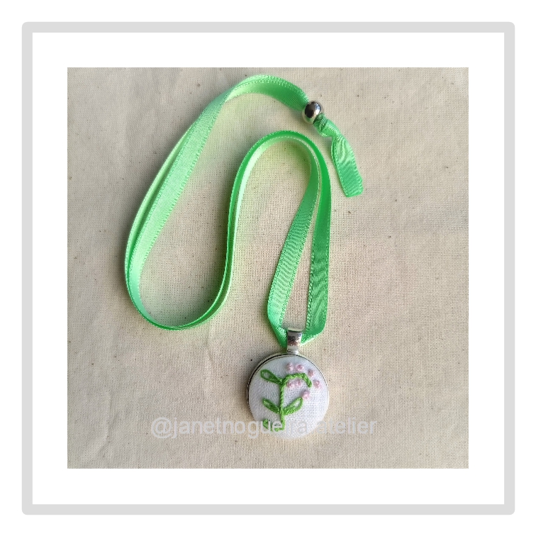 • Colar com pendente redondo bordado à mão com desenho floral em verde e amarelo e fita rosa clara