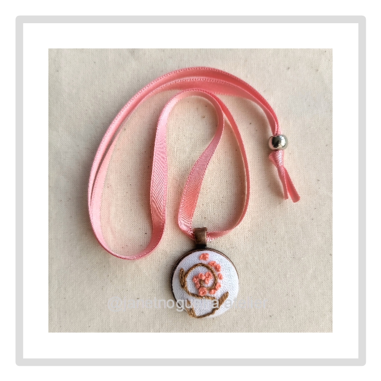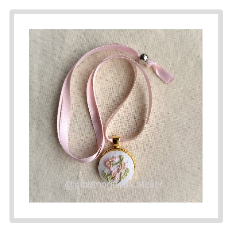 • Colar com pendente redondo bordado à mão com flores rosas e folhas verdes, fita rosa