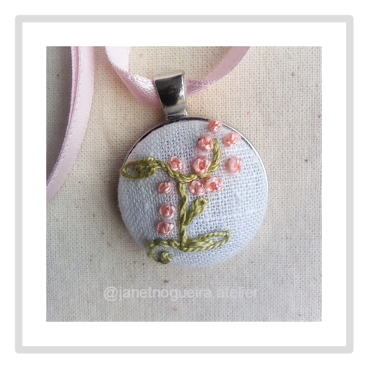• Colar com pendente bordado em tecido branco com flores rosa e folhas verdes