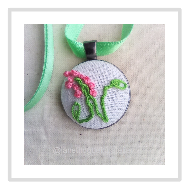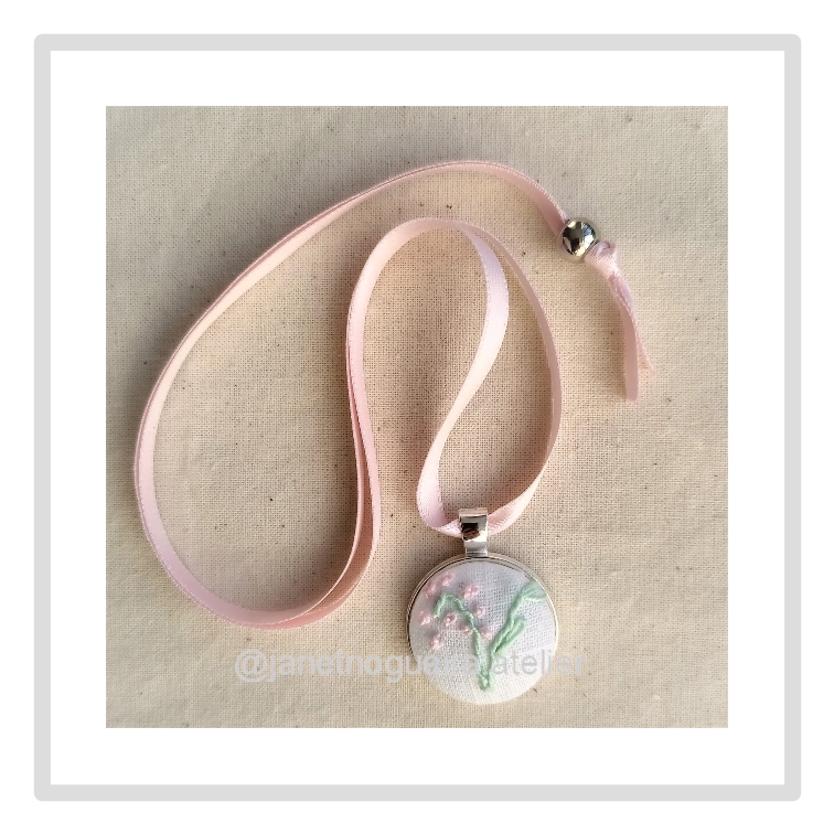 • Colar com pendente bordado branco e verde com flores rosa num fundo bege