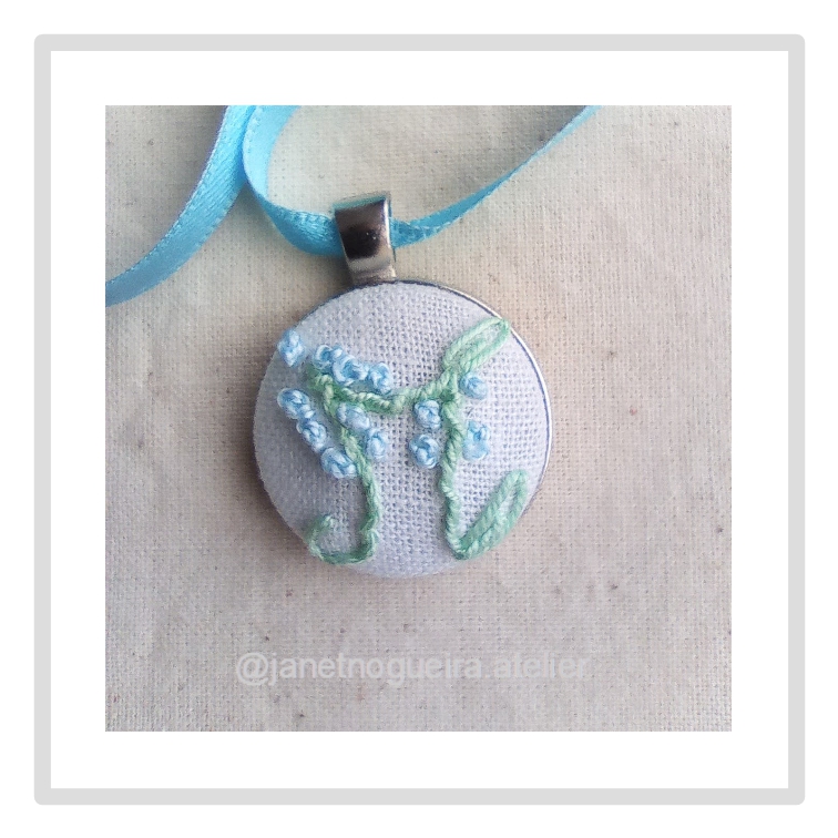 • Colar com fita azul clara e pendente redondo bordado