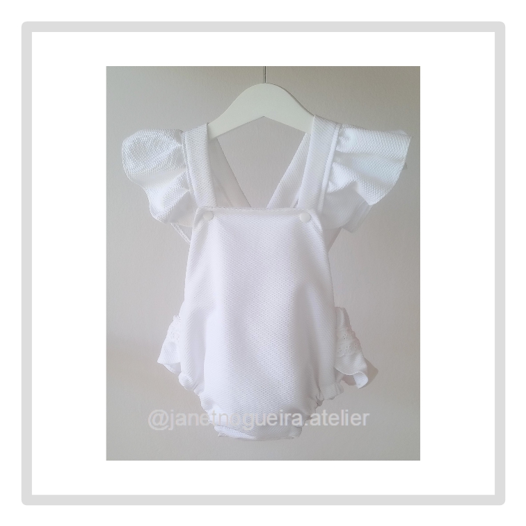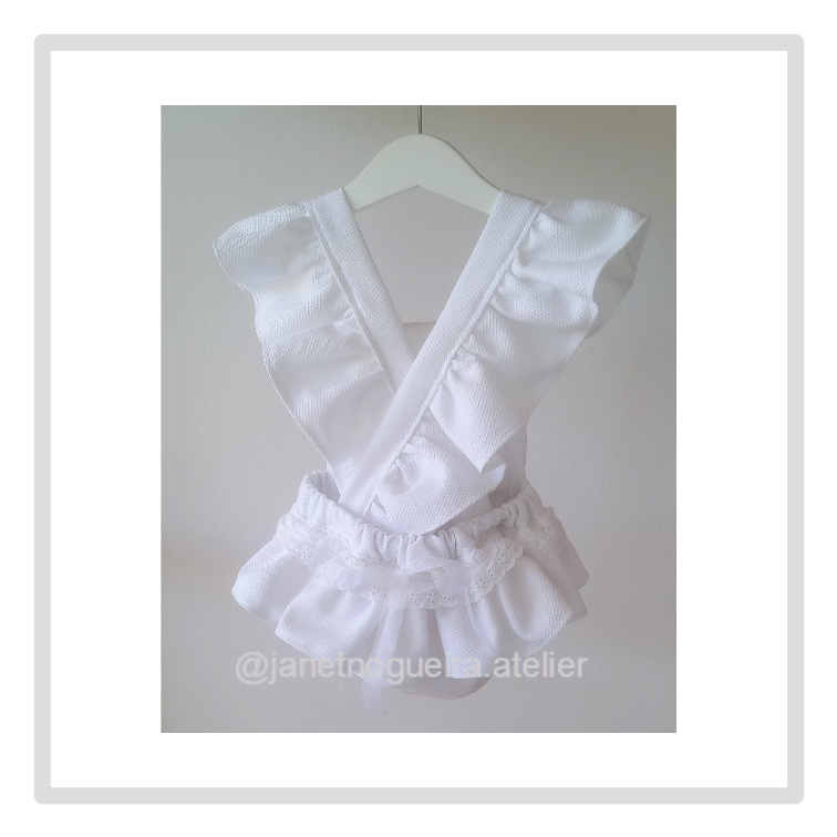 Alças cruzadas com folho apertam com mola, costas com folho e lacinho.