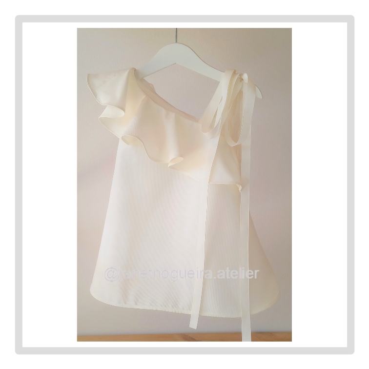 Alças de gorgurão em laço no ombro esquerdo, corte assimétrico do decote com folho.